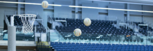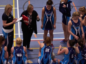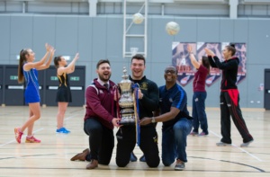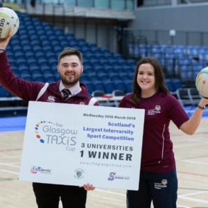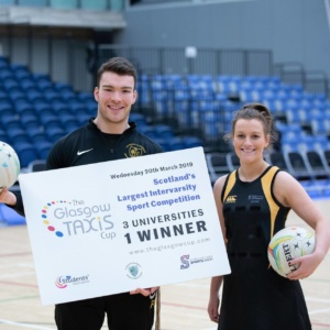 Gia Abernethy of Strathclyde Sirens Netball Team holds the Glasgow Taxis Cup watched by