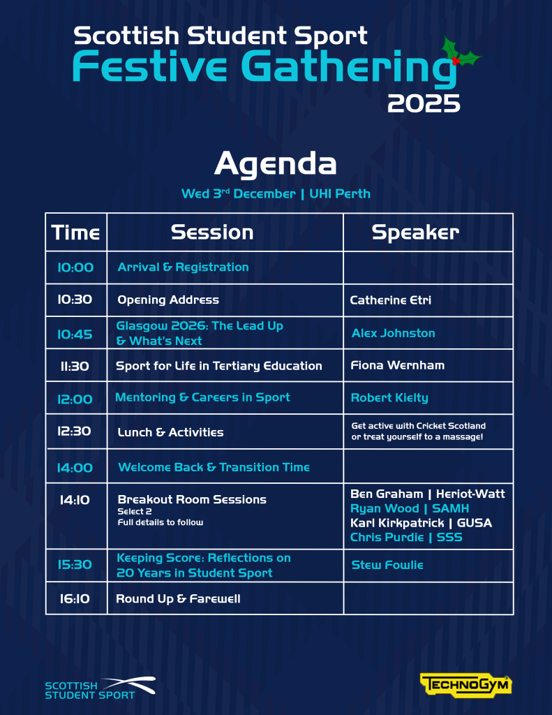 Scottish Student Sport are thrilled to announce that this year’s Festive Gathering will take place on Wednesday 3rd December at UHI Perth.